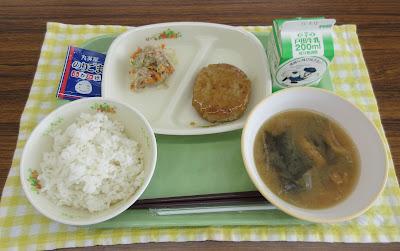 ごはん・牛乳・豆腐入りハンバーグ照り焼きソース・玉ねぎのみそ汁・ごぼうサラダ