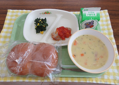 本日給食で使用した、じゃが芋「豆乳クラムチャウダー」小鹿野町産、たまねぎ           「豆乳クラムチャウダー」小鹿野町産について検査の結果、ヨウ素・セシウムとも                                    に不検出でした。