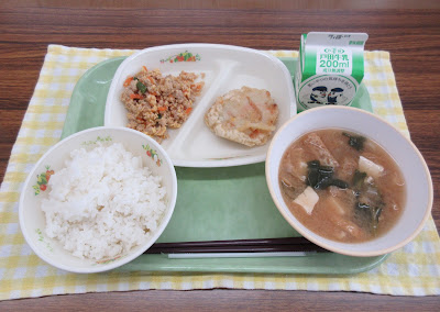 本日の献立 ごはん・牛乳・鶏肉の味噌パン粉焼き・じゃこきんぴら・なめことえのきの味噌汁 小学生 601カロリー 中学生 731カロリー 体を作るもととなる食品 牛乳、油揚げ、豆腐、味噌、鶏肉、豚肉、じゃこ、さつま揚げ 体の調子を整える食品 人参、牛蒡、長ねぎ、なめこ、...